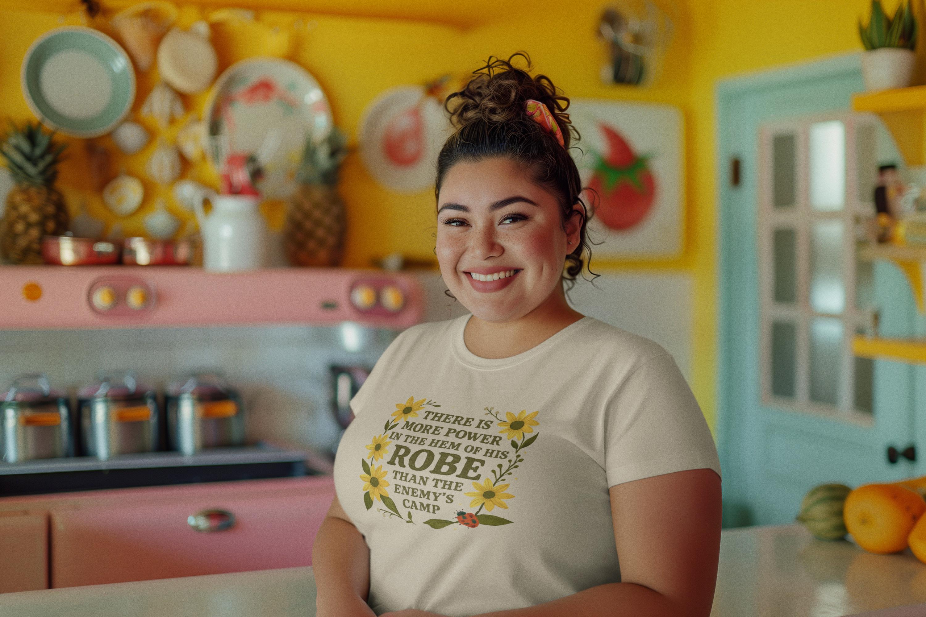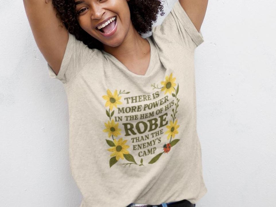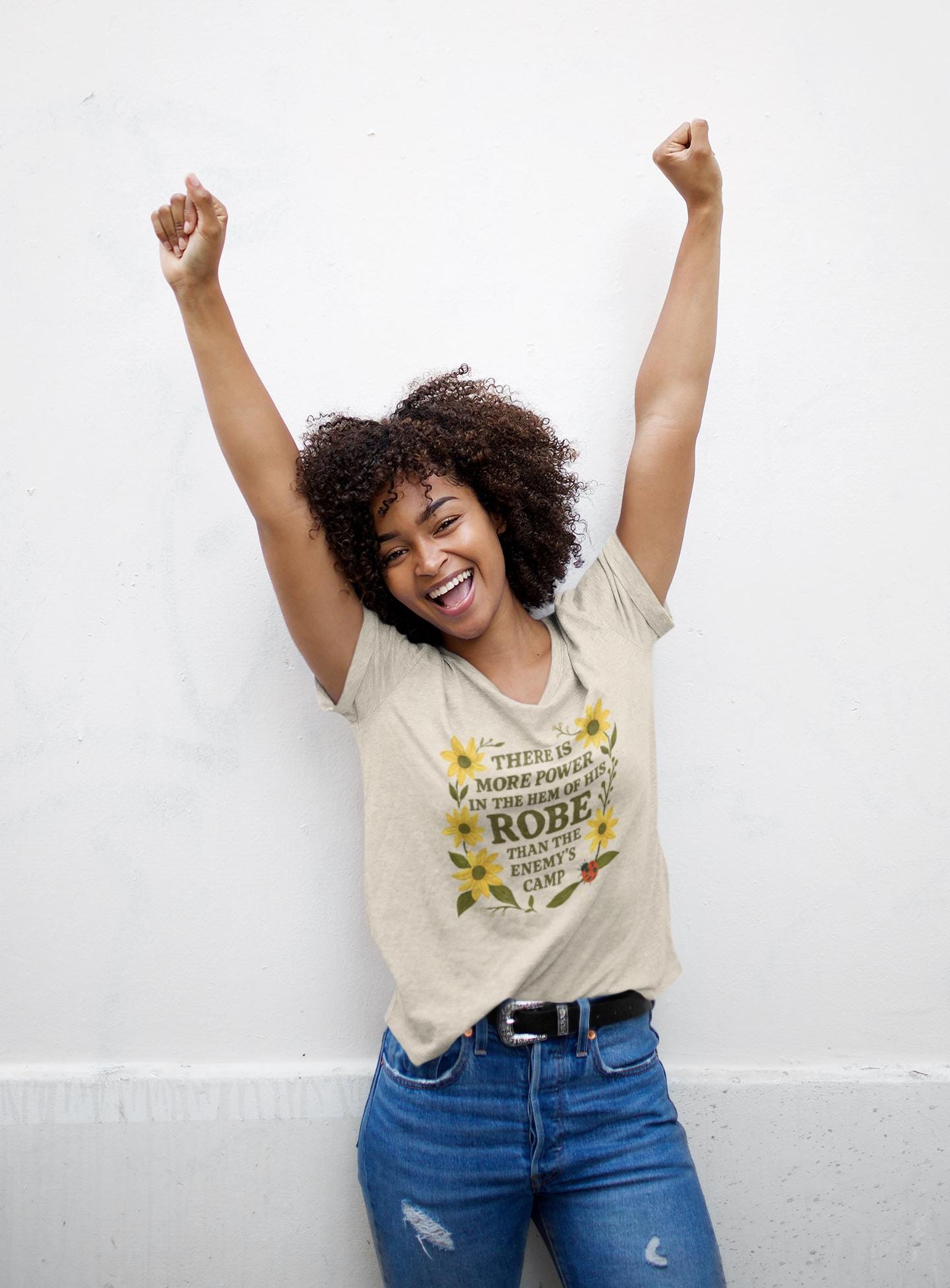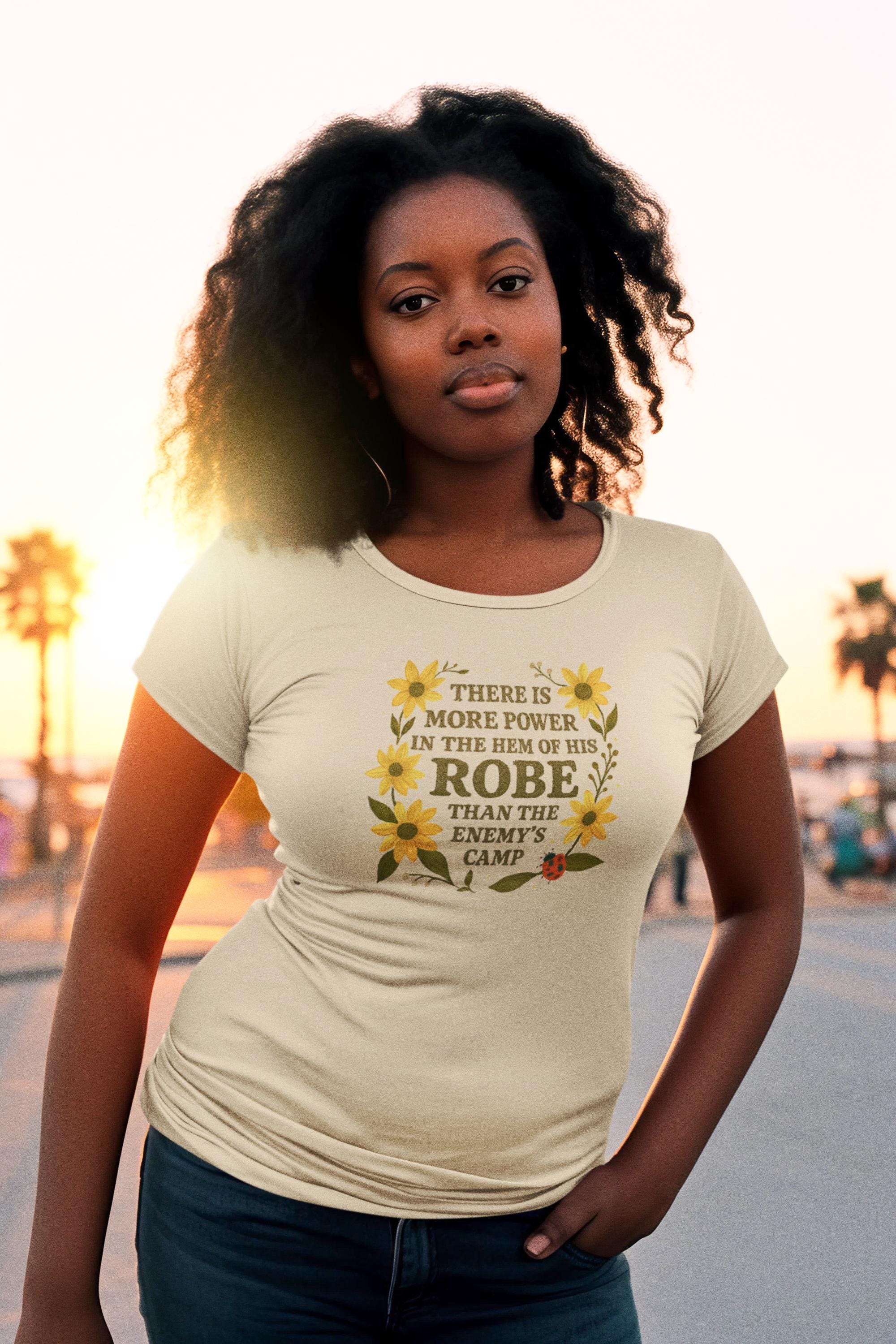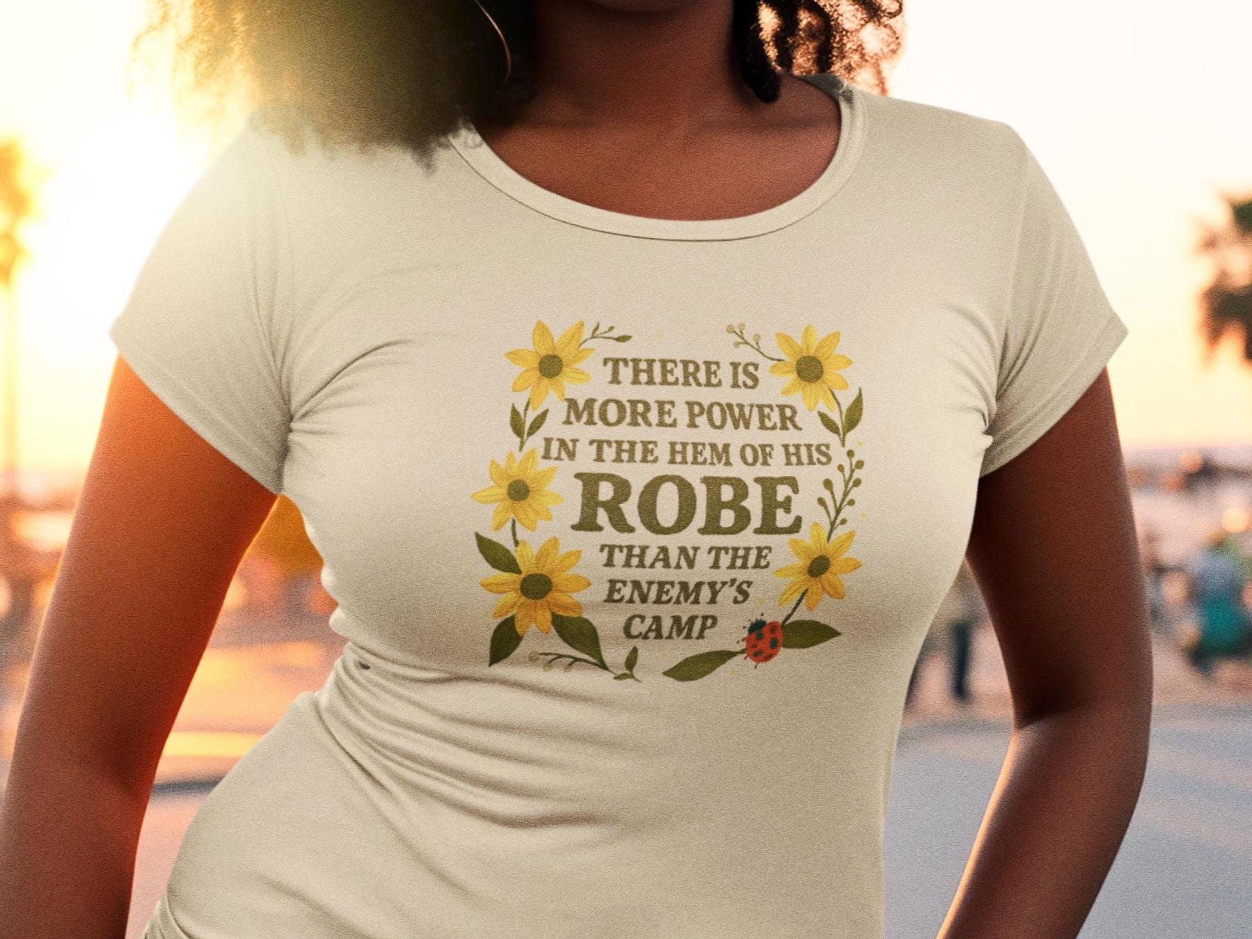 Christian T Shirt Sunflowers Song Lyrics There's More Power in The Hem of His Robe Than the Enemy's Camp Jesus T Shirt Inspiring Scriptures Natural Cream color Next Level Crew Neck T Shirt Soft. Unisex sizing. For a more form fit order a size down. Poly cotton blend has little to no shrinkage. Wash inside out with like colors. For longer life lay flat to dry but it is not required.