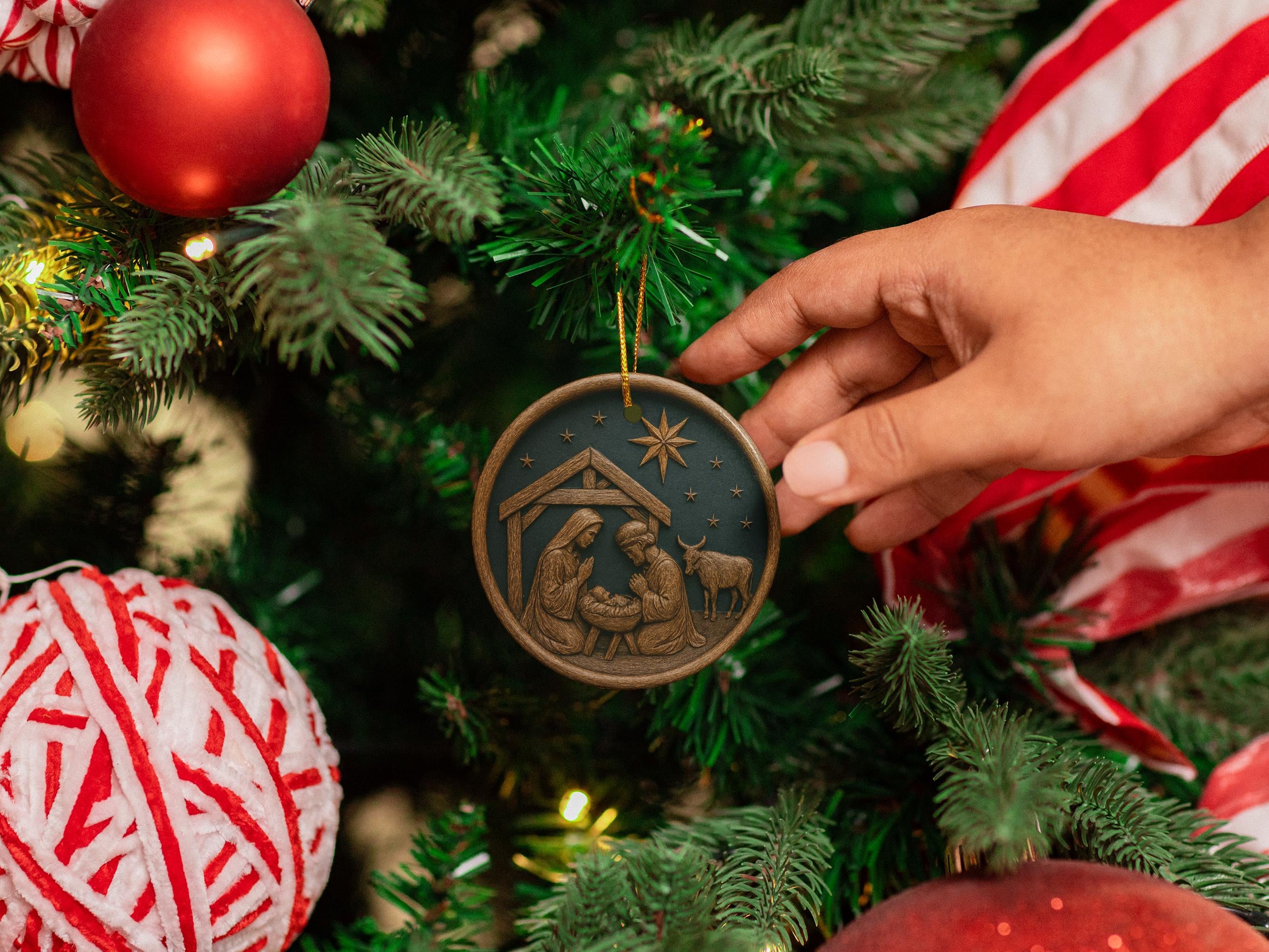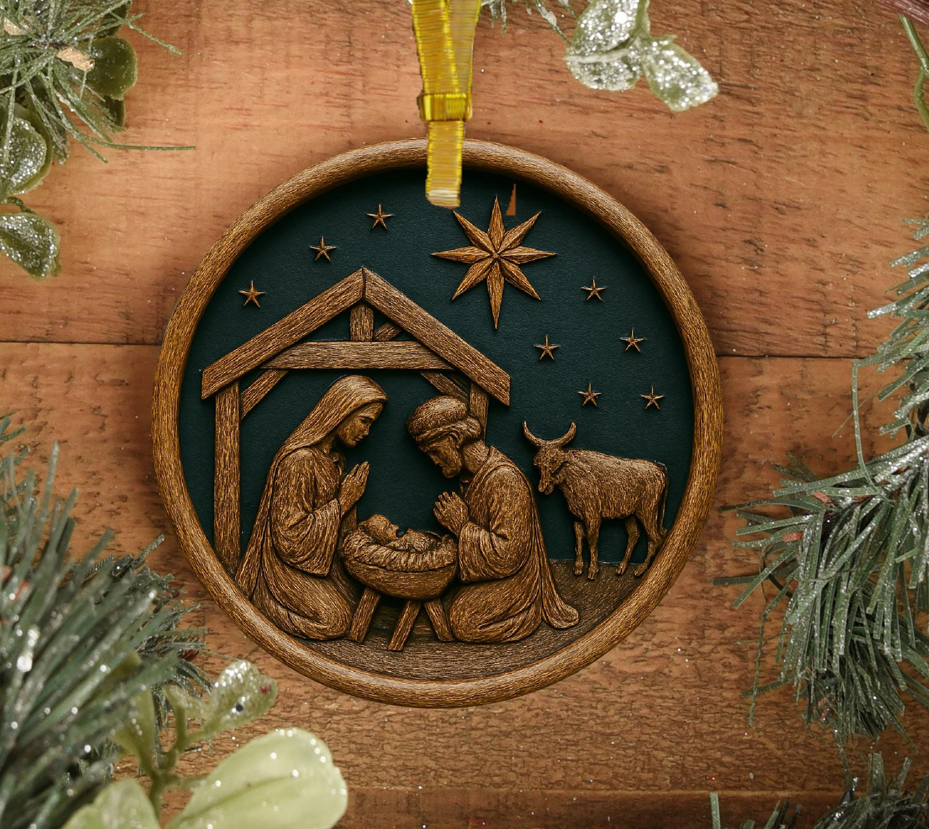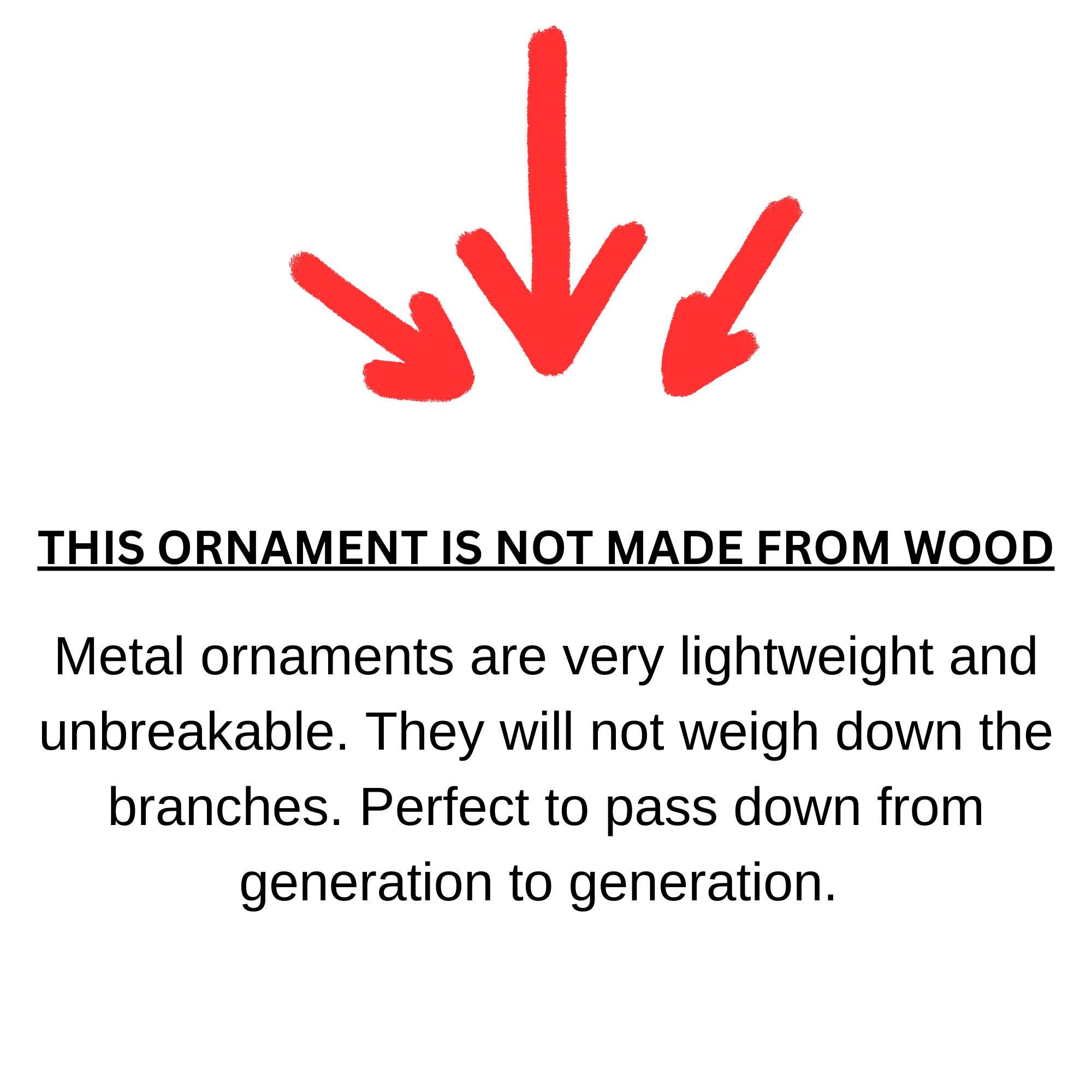 Personalized Nativity Christmas Ornament Metal Allow Manger Scene with the Look of 3D Wood Carved Finish (Not made of wood) 3.5" round and about .025" thick. Metal ornaments are very lightweight and unbreakable. They will not weigh down the branches. Perfect to pass down from generation to generation.