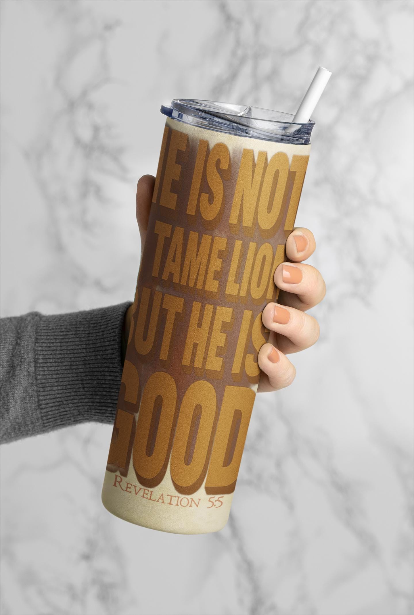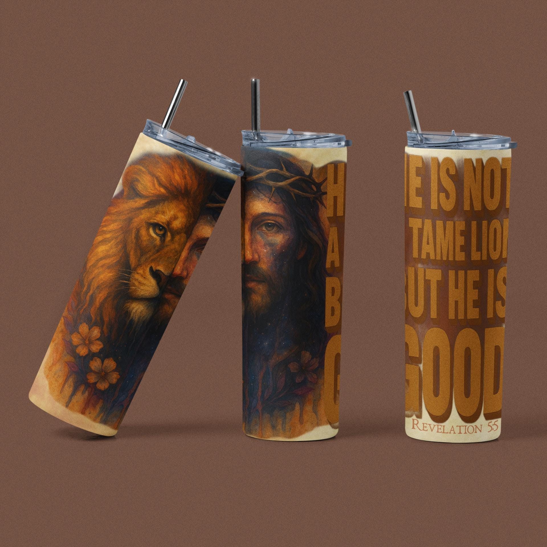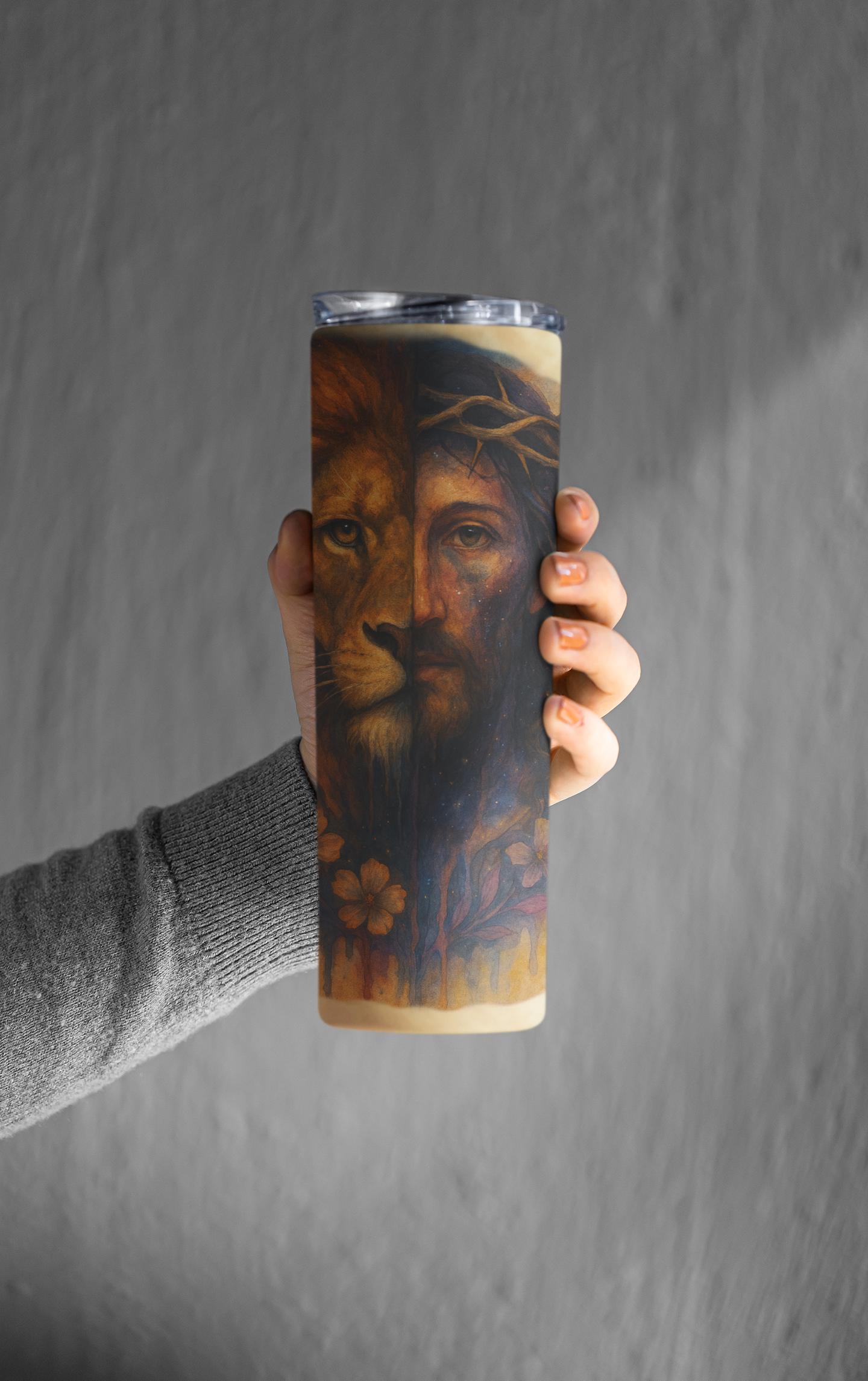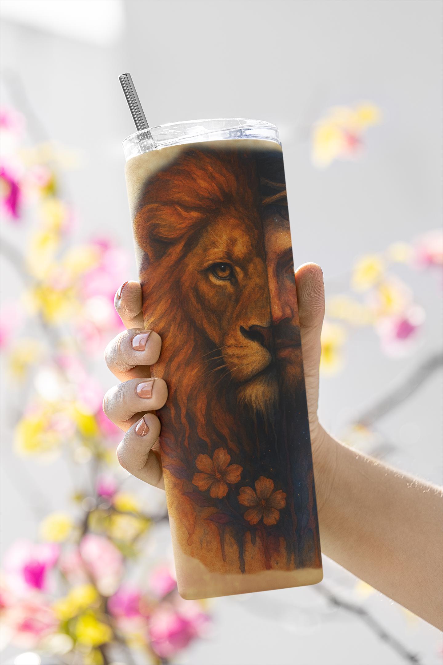 Christian Skinny Tumbler Jesus and the Lion, The Lion of Judah Water Bottle for hot or cold liquids 20 oz Metal Thermal Cup. Straw included.
